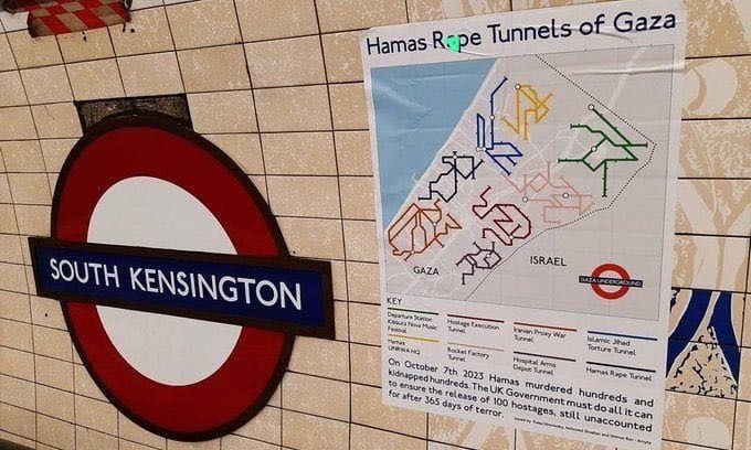 Οι αφίσες αυτές μιμούνται χάρτες του μετρό του Λονδίνου, που αναπαριστούν τις σήραγγες της Γάζας, που χρησιμοποιούνται για επιθέσεις.