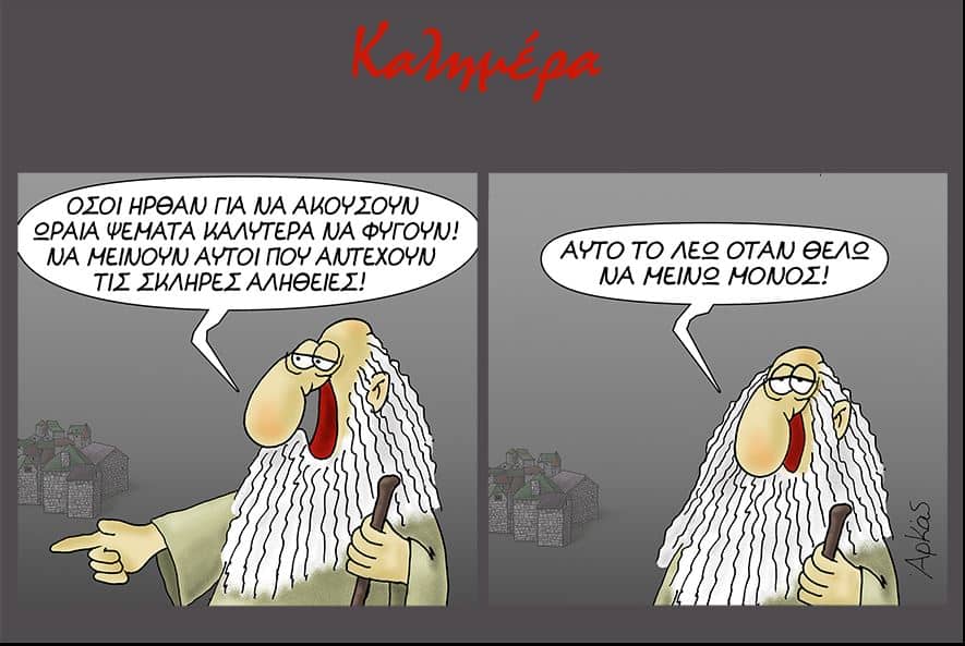Ο γνωστός σκιτσογράφος Αρκάς επανέρχεται με μία αιχμηρή καλημέρα, αυτή τη φορά επισημαίνοντας το ζήτημα της δυσκολίας που αντιμετωπίζουμε όταν πρέπει να αποδεχτούμε τις σκληρές αλήθειες. Το σκίτσο δημοσιεύθηκε την Τετάρτη, 9 Οκτωβρίου 2024, και χρησιμοποιεί τον χαρακτηριστικό προφήτη του Αρκά για να αποτυπώσει ένα κοινωνικό σχόλιο με χιουμοριστική αλλά και κριτική διάθεση.
