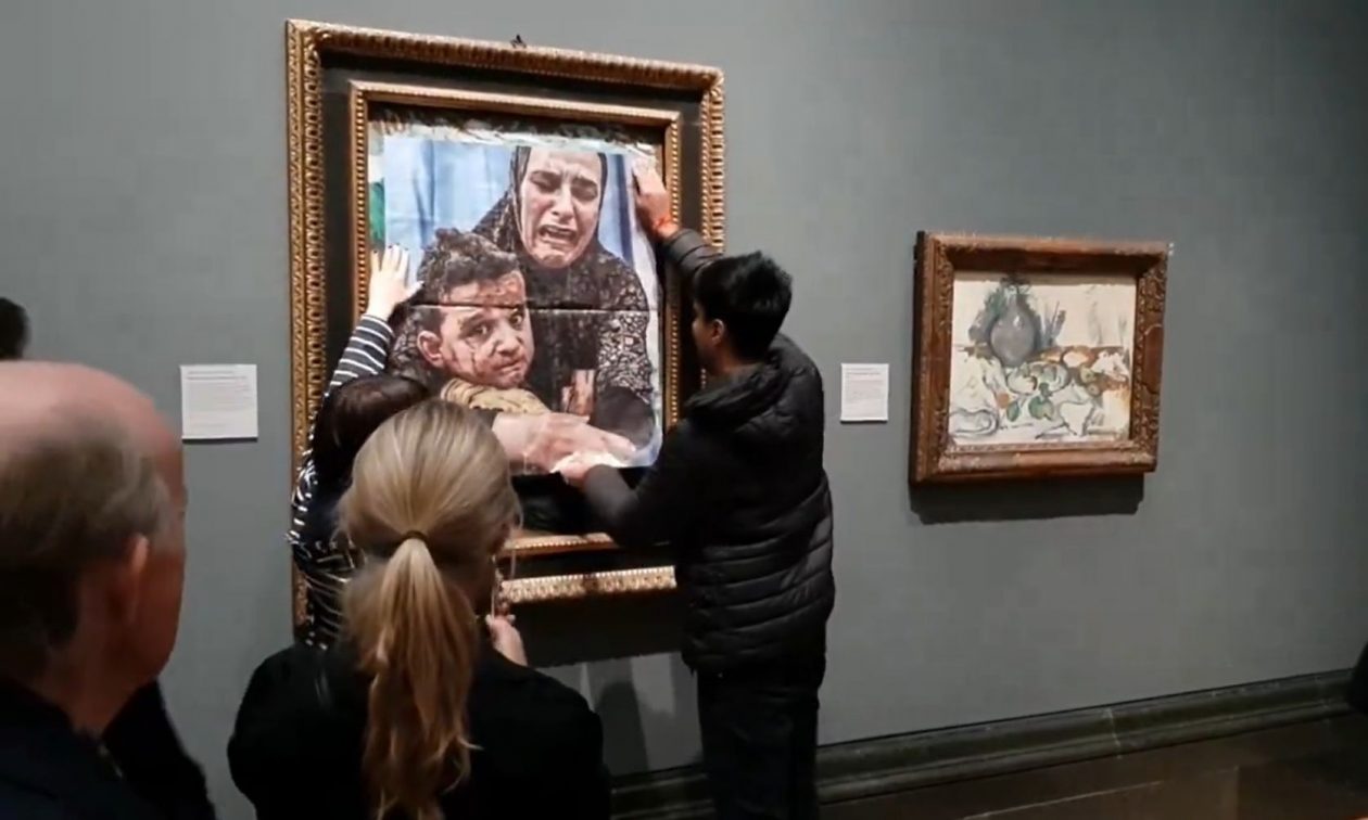 Η ομάδα Youth Demand δήλωσε ότι δύο διαδηλωτές κόλλησαν μια φωτογραφία μιας μητέρα και ενός παιδί από την Γάζα στο προστατευτικό γυάλινο κάλυμμα πάνω από το έργο του Πικάσο.
