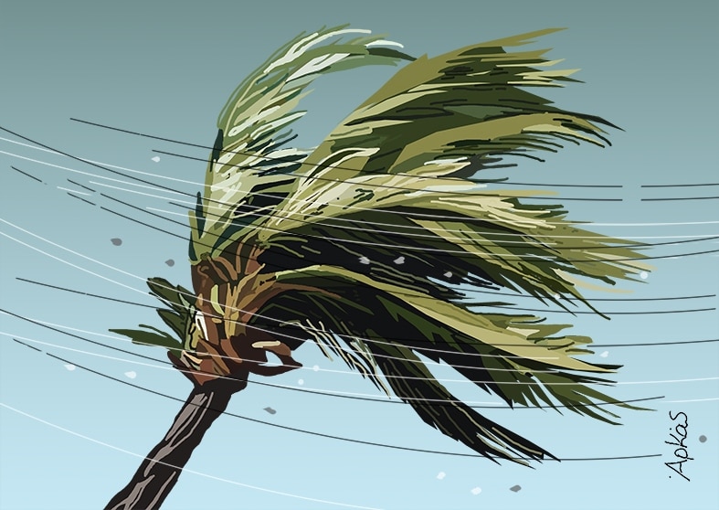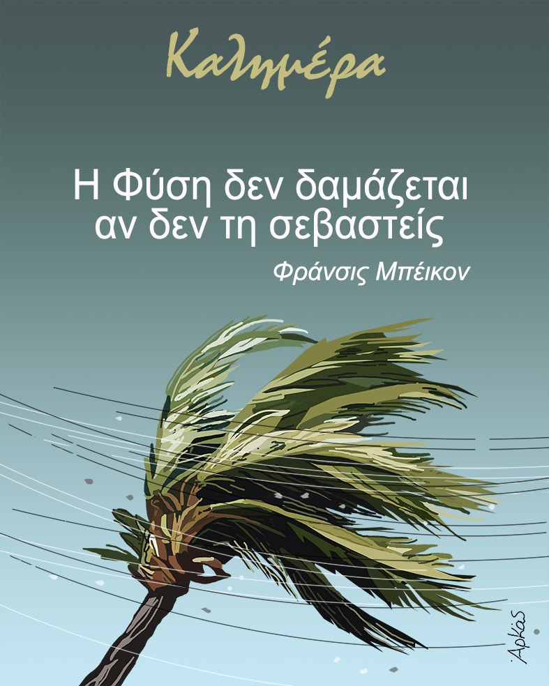 Ο γνωστός σκιτσογράφος Αρκάς επέλεξε να στείλει μια ξεχωριστή καλημέρα την Πέμπτη 10 Οκτωβρίου, αναδεικνύοντας τη σημασία του σεβασμού προς τη φύση. Στο σκίτσο που δημοσιεύτηκε, βλέπουμε έναν φοίνικα λυγισμένο από τη δύναμη του ανέμου, υποδηλώνοντας τις δυσκολίες που αντιμετωπίζει αυτή την περίοδο η Φλόριντα των ΗΠΑ εξαιτίας του τυφώνα Μίλτον.