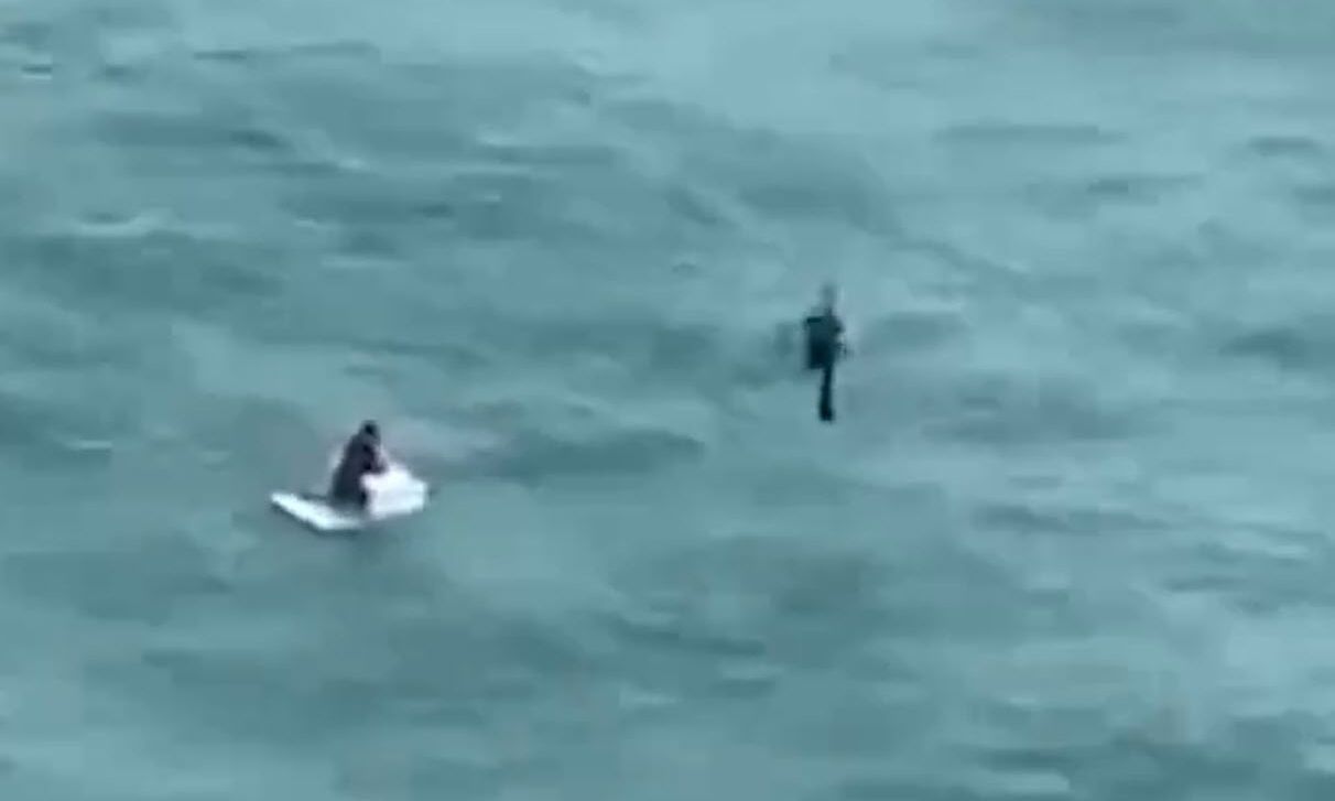 Τα δραματικά πλάνα της διάσωσης καταγράφουν έναν διασώστη να κατεβαίνει από το ελικόπτερο στο νερό. Στη συνέχεια αρχίζει να κολυμπάει προς τον άνδρα που είναι γονατιστός πάνω από στο ψυγείο που του έσωσε τη ζωή…