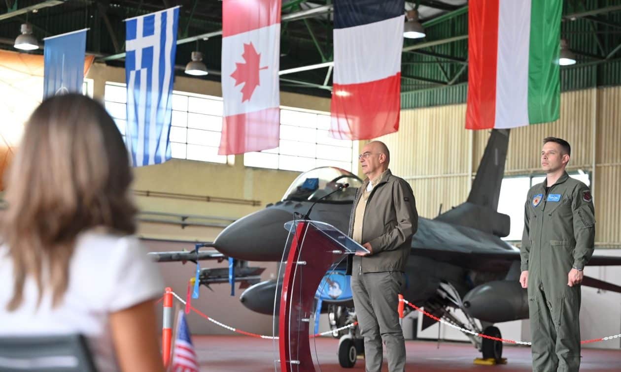 Για τη νέα εποχή στην ελληνική Πολεμική Αεροπορία με την απόκτηση των Rafale και τη μελλοντική απόκτηση των F-35 αλλά και τη δημιουργία αντιαεροπορικού και αντί -drone θόλου, ο κ. Δένδιας υπογράμμισε ότι μπορεί «να υποστηρίξει τις επιχειρήσεις του ΝΑΤΟ, σύμφωνα με το Διεθνές Δίκαιο και τον καταστατικό χάρτη των Ηνωμένων Εθνών, προβάλλοντας την πατρίδα μας ως τον αξιόπιστο και σοβαρό σύμμαχο, τον πυλώνα της σταθερότητας στην Ανατολική Μεσόγειο και πέραν από αυτή». «Πάντα υπογραμμίζω», συνέχισε αναφερόμενος στο ΝΑΤΟ, «ότι είναι μια Συμμαχία αξιών, ταγμένη στην υπεράσπιση όχι μόνο των χωρών που ανήκουν στη Συμμαχία, αλλά και του Διεθνούς Δικαίου».