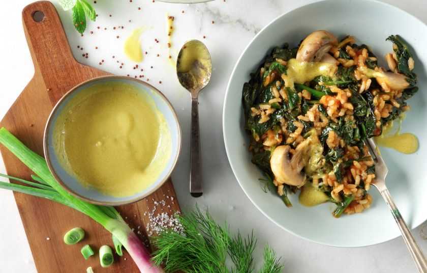 Σοτάρουμε στο μισό λάδι, σε μέτρια φωτιά, τα κρεμμύδια για 5 λεπτά. Ρίχνουμε το σπανάκι και το σκόρδο και σοτάρουμε για 6-8 λεπτά, μέχρι να πέσει ο όγκος του. Προσθέτουμε την ντομάτα και 400 ml νερό και μαγειρεύουμε για 10 λεπτά, μέχρι να δέσει ελαφρώς η σάλτσα. Ρίχνουμε το ρύζι, τα μανιτάρια, τον δυόσμο, τον άνηθο, το μοσχοκάρυδο και αλατοπίπερο και μαγειρεύουμε για 15 λεπτά, μέχρι να μαλακώσει το ρύζι. Αποσύρουμε από τη φωτιά. Χτυπάμε στο μούλτι τη μουστάρδα, το ξύσμα και τον χυμό με το υπόλοιπο λάδι μέχρι να φτιάξουμε λεία σάλτσα. Περιχύνουμε το σπανακόρυζο, ανακατεύουμε απαλά και σερβίρουμε.