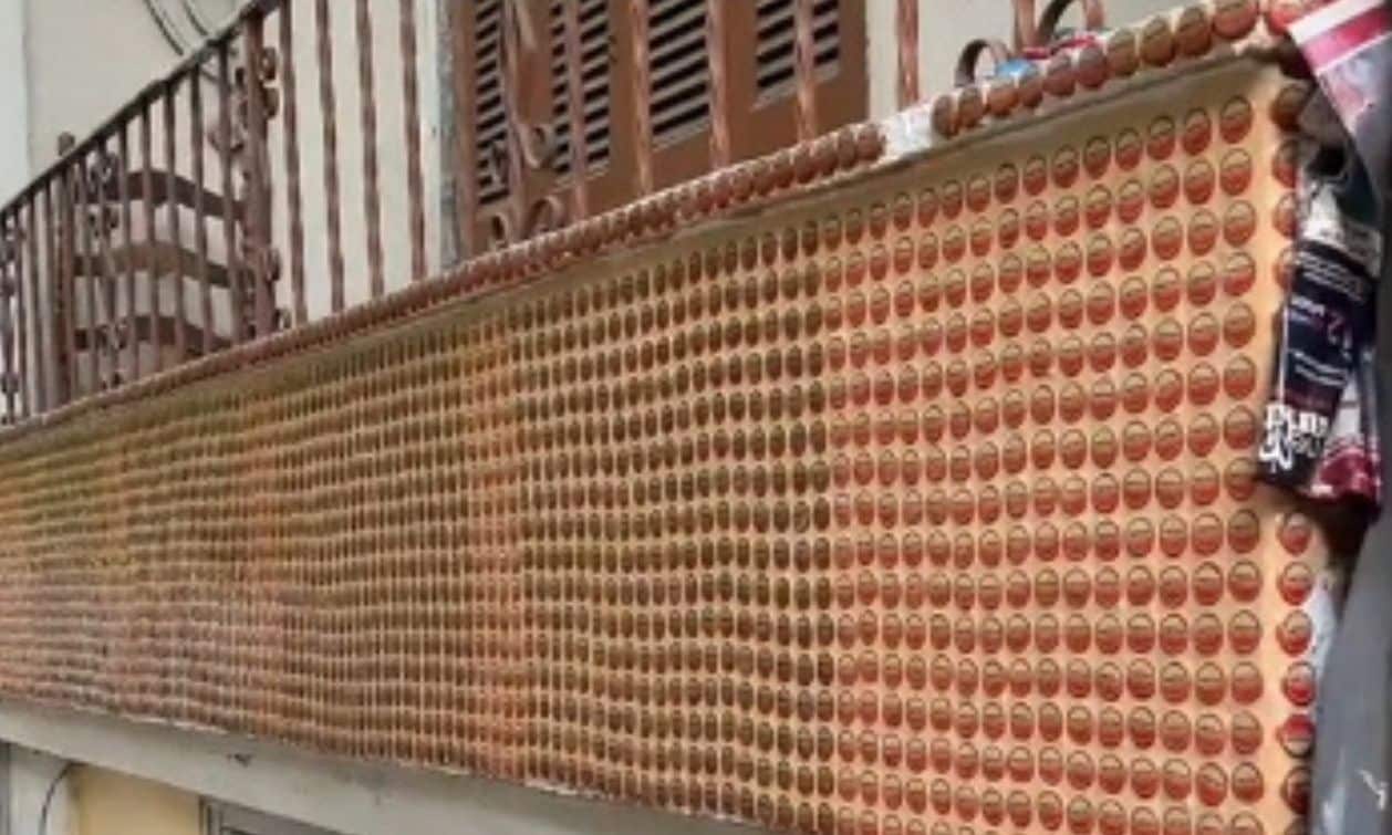 Το βίντεο αναρτήθηκε στα social media και ειδικότερα στο TikTok. Αποτυπώνει ένα μπαλκόνι στη Θεσσαλονίκη, στην οδό Στρατηγού Δουμπιώτη, το οποίο έχει «ντυθεί» με αμέτρητα δεκάδες καπάκια μπύρας.