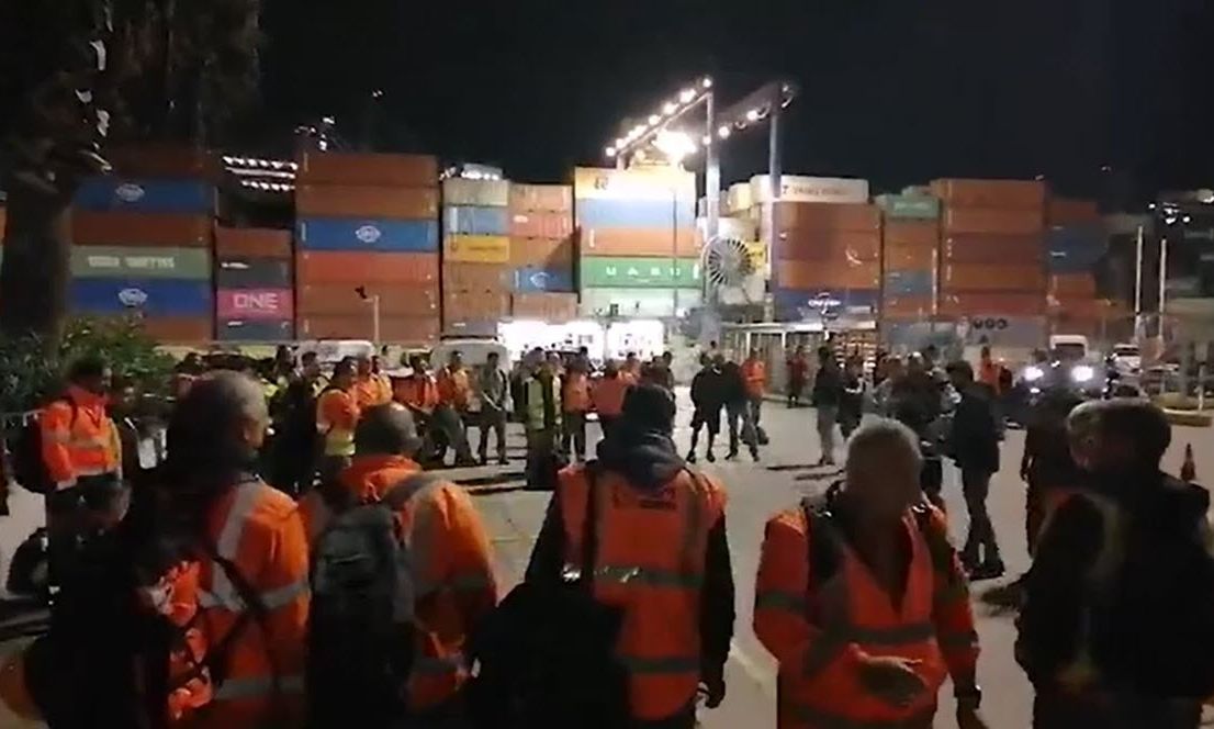 Με το σύνθημα «Λευτεριά στην Παλαιστίνη! ΝΑΤΟ φονιάς, το ξέρει ο ντουνιάς», στο πανό του σωματείου ΕΝΕΔΕΠ, οι λιμενεργάτες της COSCO εμπόδισαν το βράδυ της Πέμπτης να φορτωθεί κοντέινερ με πυρομαχικά το οποίο προορίζεται για το Ισραήλ.