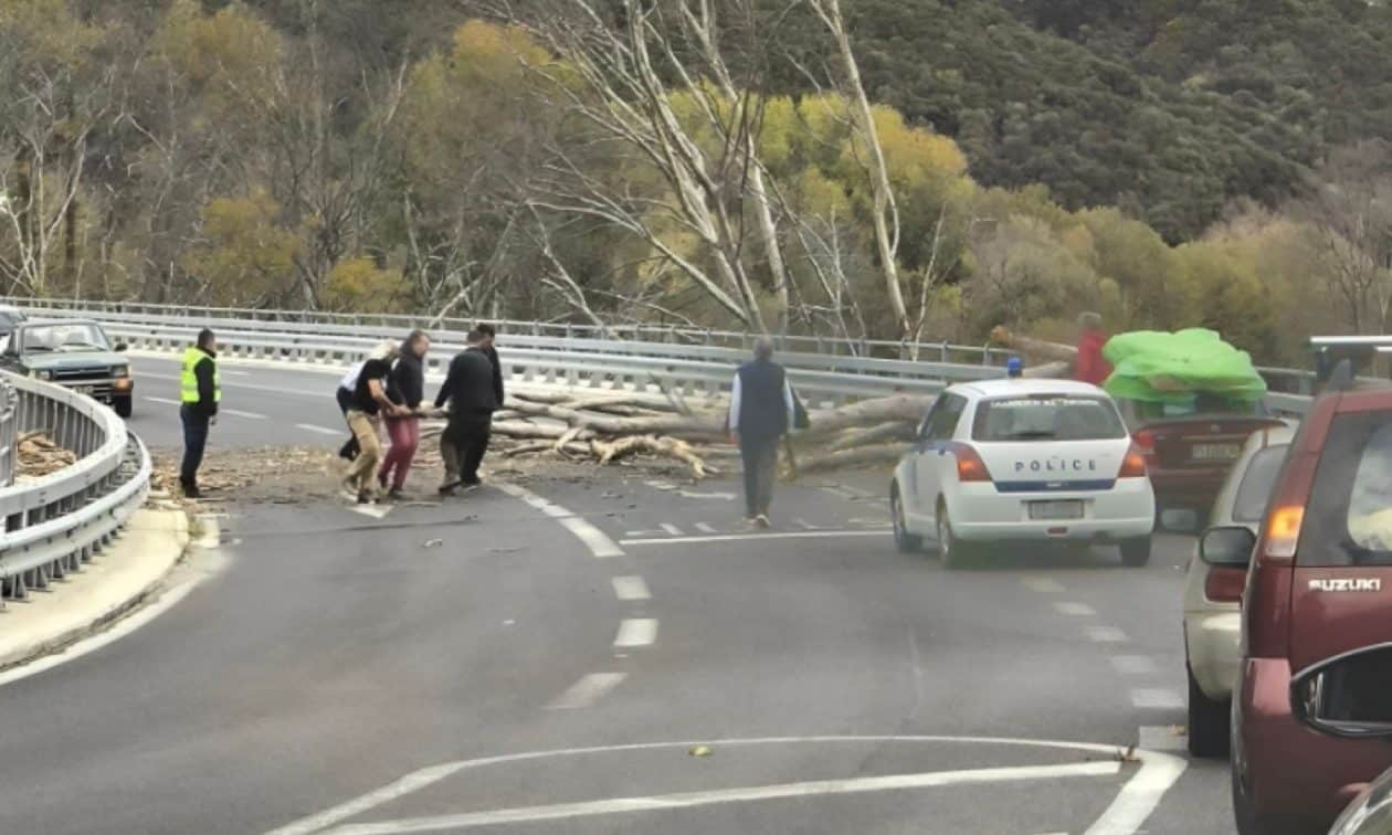Τρόμος για διερχόμενους οδηγούς στην παλιά εθνική οδό στα Τέμπη και ειδικότερα στη διασταύρωση Στομίου, όπου γύρω στις 12 σήμερα το μεσημέρι του Σαββάτου, κατέρρευσε τεράστιο δένδρο στο οδόστρωμα της εθνικής οδού.