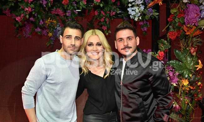 Η Νατάσα Θεοδωρίδου λαμπερή και ευδιάθετη δεν έχασε στιγμή το χαμόγελό της, ενώ έδειχνε να απολαμβάνει το γεγονός ότι είναι η μοναδική γυναίκα του σχήματος, η οποία πλαισιώνεται από τους δυο ταλαντούχους καλλιτέχνες.