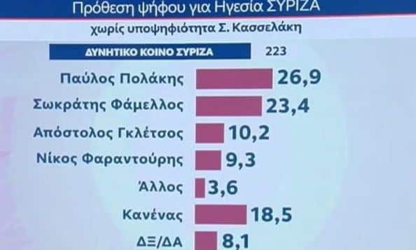 Ο Παύλος Πολάκης βρίσκεται στην πρώτη θέση στην κούρσα για τη νέα ηγεσία του ΣΥΡΙΖΑ. Ειδικότερα, οι ερωτηθέντες της δημοσκόπησης που δήλωσαν πως είναι δυνητικοί ψηφοφόροι του ΣΥΡΙΖΑ απάντησαν πως ανάμεσα στους υποψηφίους, χωρίς την υποψηφιότητα Κασσελάκη, προτιμούν σε ποσοστό 26,9% τον Παύλο Πολάκη.