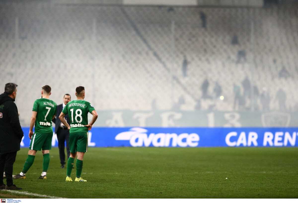 Στο 70ο λεπτό του αγώνα, ο διαιτητής πήρε τους παίκτες και κατευθύνθηκε στα αποδυτήρια, αφού από τις συμπλοκές έξω από το γήπεδο, τα δακρυγόνα ώθησαν τους φιλάθλους στην εξέδρα, μέσα στον αγωνιστικό χώρο, για να δημιουργηθεί το απόλυτο μπάχαλο στο ΟΑΚΑ και να διακοπεί οριστικά ένα ακόμη ελληνικό ντέρμπι.
