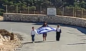 Οι δυο μαθητές του δημοτικού σχολείου του νησιού -ένα αγόρι κι ένα κορίτσι- κρατώντας τη γαλανόλευκη στα χέρια σκόρπισαν ρίγη συγκίνησης και χαράς.