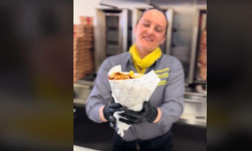Από το βίντεο που έχουν αναρτήσει στον λογαριασμό τους στο TikTok είναι εύκολο να διακρίνουμε πως το σουβλάκι τους ξεχειλίζει τόσο από γύρο, όσο και από πατάτες, με αποτέλεσμα το τύλιγμα του να γίνεται πραγματικά με το ζόρι.