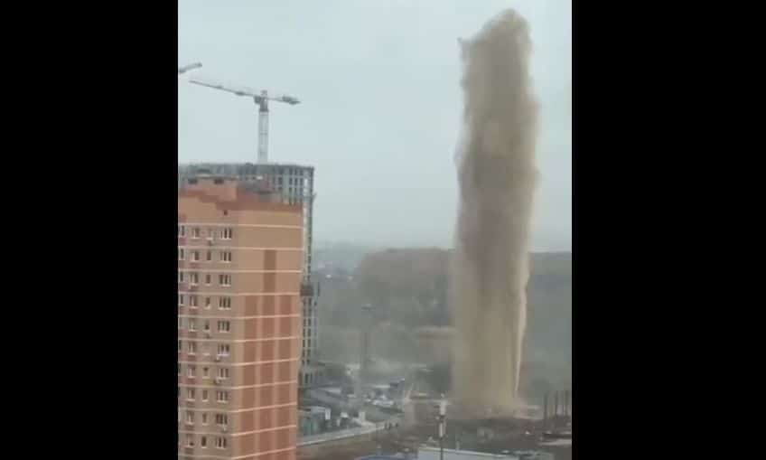 Τα πλάνα δείχνουν έναν «πύργο» από θολό νερό να αναβλύζει από έναν σωλήνα δίπλα σε αυτό που φαίνεται να είναι ένα εργοτάξιο στην περιοχή Novaya Moskva – πριν πέσει πάνω σε κοντινά αυτοκίνητα και κτίρια.