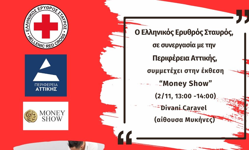 Ο Ελληνικός Ερυθρός Σταυρός (Ε.Ε.Σ.), στο πλαίσιο των συνεχών δράσεων του για τη διάδοση των Πρώτων Βοηθειών στην Ελληνική κοινωνία και σε συνεργασία με την Περιφέρεια Αττικής και την εντεταλμένη Περιφερειακή Σύμβουλο Άλσων – Πάρκων και Υγείας Ζώων κ. Ρίτα Πικρού Μωραϊτάκη, θα συμμετάσχει στην έκθεση “Money Show”, στις 2 Νοεμβρίου 2024 και ώρες 13:00 – 14:00, στο ξενοδοχείο Divani Caravel (αίθουσα Μυκήνες).