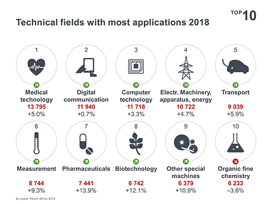 Η ιατρική τεχνολογία παραμένει ο τομέας στον οποίο υποβάλλονται οι περισσότερες αιτήσεις για διπλώματα ευρεσιτεχνίας (αύξηση κατά 5% το 2018), ενώ ακολουθεί η ψηφιακή επικοινωνία και την τεχνολογία των υπολογιστών. Η ισχυρότερη ανάπτυξη μεταξύ των πρώτων δέκα τομέων καταγράφηκε στις βιοεπιστήμες, ενώ τα φαρμακευτικά προϊόντα και η βιοτεχνολογία αυξήθηκαν συνολικά κατά 13%.
