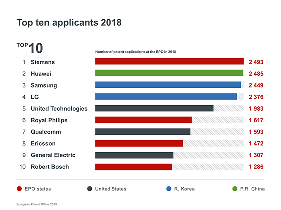 Τα στοιχεία του European Patent Office δείχνουν αύξηση των αιτήσεων διπλωμάτων ευρεσιτεχνίας απ’ όλες τις μεγάλες περιοχές του κόσμου, ωστόσο, οι ευρωπαϊκές εταιρείες είχαν το προβάδισμα με μερίδιο 47%. Οι ασιατικές εταιρείες είχαν επίσης μια καλή επίδοση, ειδικά η Κίνα, η Ιαπωνία και η Κορέα, ενώ οι ΗΠΑ αντιπροσώπευαν το 25% των συνολικών αιτήσεων, ακολουθούμενες από τη Γερμανία, την Ιαπωνία, τη Γαλλία και την Κίνα. Πάντως, οι αιτήσεις από την Κίνα αυξήθηκαν το 2018 με κατά 8,8% – το χαμηλότερο ποσοστό τα τελευταία πέντε χρόνια.