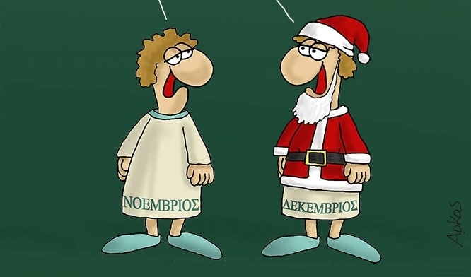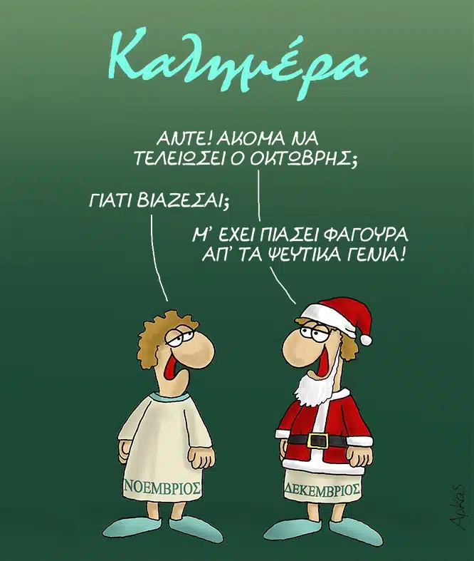 Ο Αρκάς δεν σταματά να μας χαρίζει χιουμοριστικές στιγμές με την καυστική του σάτιρα. Στο σκίτσο που δημοσιεύθηκε σήμερα 31 Οκτωβρίου, ο αγαπημένος σκιτσογράφος της καρδιάς μας ασχολείται με την τάση να προετοιμάζουμε τις γιορτές των Χριστουγέννων πολύ νωρίτερα, αποτυπώνοντας αυτή τη βιασύνη μέσα από δύο ανθρωπόμορφους μήνες: τον Νοέμβριο και τον Δεκέμβριο.