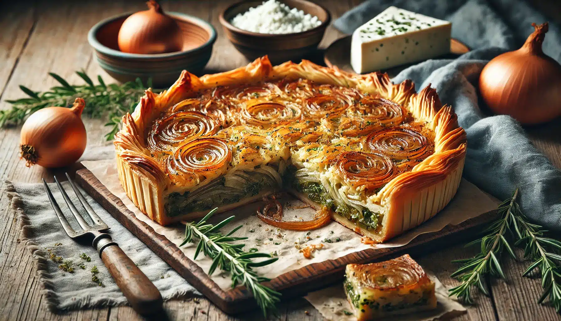 Η κρεμμυδόπιτα είναι μια παραδοσιακή πίτα της ελληνικής κουζίνας, γεμάτη με γεύση από γλυκά καραμελωμένα κρεμμύδια και φρέσκα μυρωδικά. Είναι ιδανική για ένα ζεστό γεύμα ή ως συνοδευτικό. Με το τραγανό φύλλο και το πλούσιο εσωτερικό της, αυτή η πίτα φέρνει όλη τη θαλπωρή και τη νοστιμιά της ελληνικής παράδοσης στο τραπέζι σας.