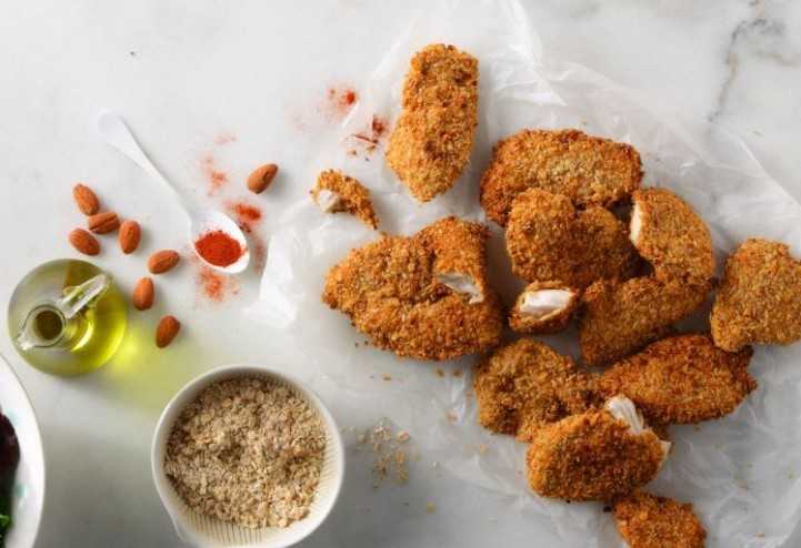 Αλεύρωμα με καλαμποκάλευρο, πέρασμα μόνο από ασπράδια και μετά από «γαλέτα» από τριμμένα αμύγδαλα και κουάκερ είναι τα μυστικά αυτού του ξεχωριστού πανέ.