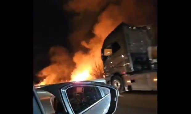 Οι πυροσβέστες εργάζονται για την κατάσβεση της πυρκαγιάς. Εν μέσω του περιστατικού, οι IDF λένε ότι επιχείρησαν να καταρρίψουν το drone, πριν αυτό τελικά προσκρούσει κοντά σε έναν αυτοκινητόδρομο.