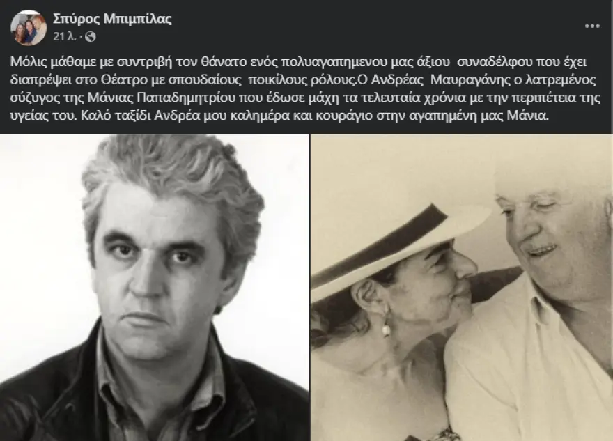 Ο Ανδρέας Μαυραγάνης υπήρξε σημαντική μορφή του ελληνικού θεάτρου, με πλούσια καριέρα και αξιοσημείωτες ερμηνείες. Η σύζυγός του, Μάνια Παπαδημητρίου, επίσης καταξιωμένη ηθοποιός, βρίσκεται αντιμέτωπη με αυτή τη μεγάλη απώλεια.