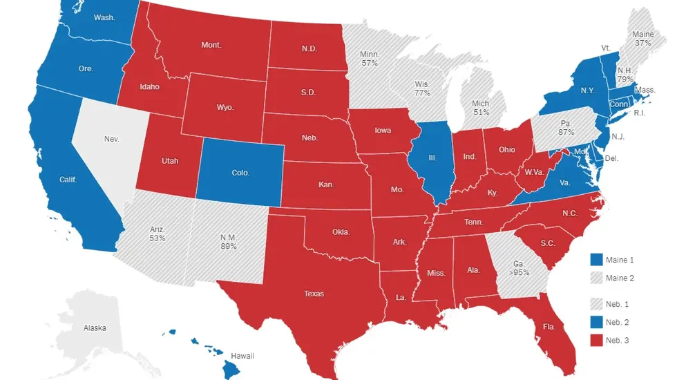 Εκλογές ΗΠΑ: Η μάχη μεταξύ Ντόναλντ Τραμπ και Κάμαλα Χάρις στις επτά διεκδικούμενες πολιτείες ως τις 07:00 (ώρα Ελλάδας) φαίνεται ότι ξεκαθαρίζει, καθώς σε όλες προηγείται ο Ντόναλντ Τραμπ.