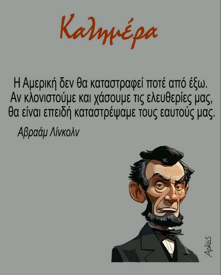 Στον απόηχο των εκλογών στις ΗΠΑ, ο γνωστός σκιτσογράφος Αρκάς μας καλημερίζει με ένα σκίτσο του Αβραάμ Λίνκολν, αναδεικνύοντας τα διαχρονικά λόγια του για την προστασία των ελευθεριών και της εθνικής ενότητας. Το εν λόγω σκίτσο έρχεται σε μια στιγμή που οι Αμερικανοί έχουν λάβει αποφάσεις για το μέλλον της χώρας τους, και η αναφορά του Αρκά στις δηλώσεις του Λίνκολν προσφέρει μια στοχαστική υπενθύμιση της ευθραυστότητας των δημοκρατικών αρχών. Με αυτό το σκίτσο, ο Αρκάς μας καλεί να αναλογιστούμε την αξία της ελευθερίας και της ενότητας, ιδέες που ο Λίνκολν υπερασπίστηκε μέχρι τέλους.