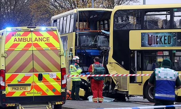 Το πίσω μέρος του άλλου λεωφορείου είχε επίσης καταστραφεί, με αυτόπτες μάρτυρες να λένε ότι το ένα λεωφορείο «εμβόλισε» το άλλο, το οποίο διαπέρασε τον μεταλλικό φράχτη.