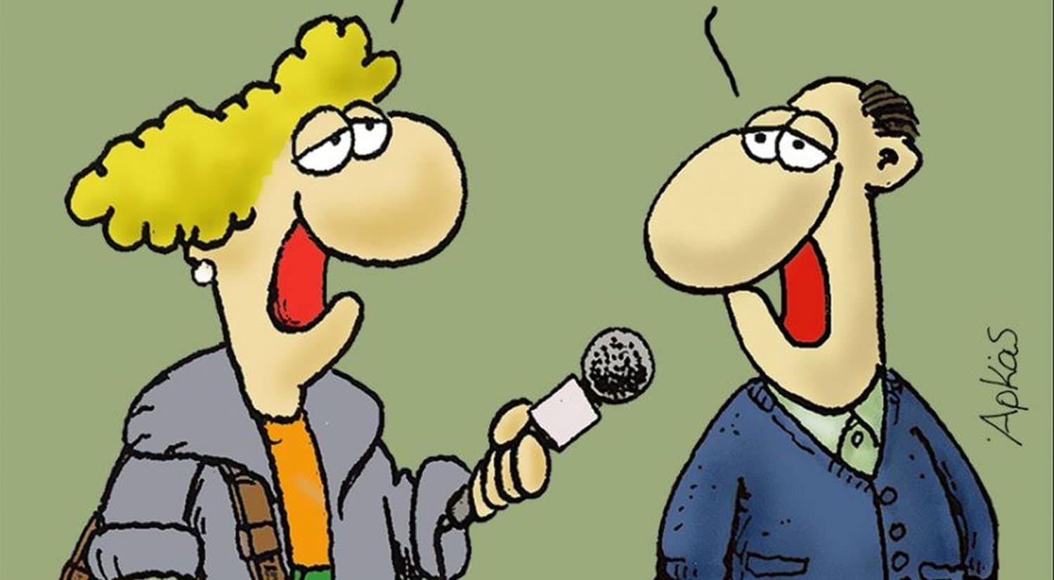 Στο σκίτσο, ο Αρκάς παρουσιάζει δύο χαρακτήρες, μια δημοσιογράφο με μικρόφωνο και έναν απλό πολίτη. Η δημοσιογράφος ρωτά τον πολίτη: