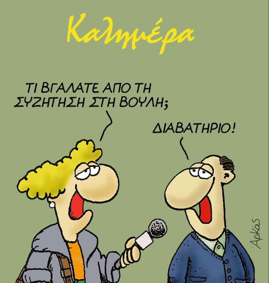 Ο διάσημος σκιτσογράφος Αρκάς, μάς καλημερίζει με μια δόση χιούμορ και καυστικής κριτικής, σχολιάζοντας τα τρέχοντα γεγονότα στη Βουλή. Το σημερινό σκίτσο του, αποτελεί μια απεικόνιση της πολιτικής επικαιρότητας με πολλαπλές αναγνώσεις.