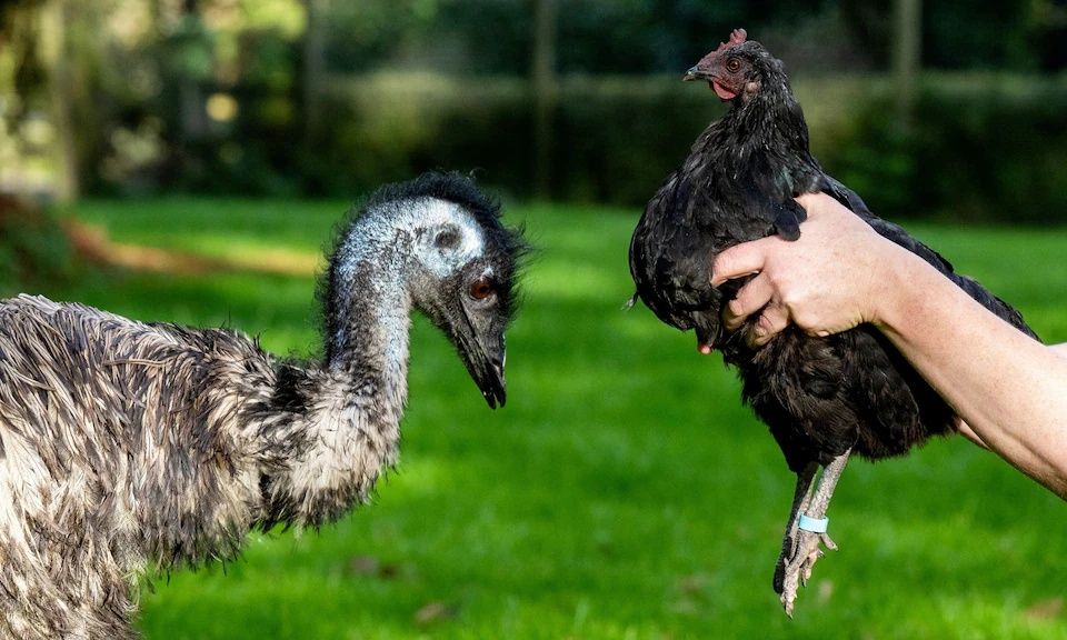 Ένα εγκαταλελειμμένο εμού ευδοκιμεί σε ένα βρετανικό πτηνοτροφείο αφού ανατράφηκε από μια απίθανη ανάδοχη μητέρα που είναι μόλις το ένα δέκατο του μεγέθους του.