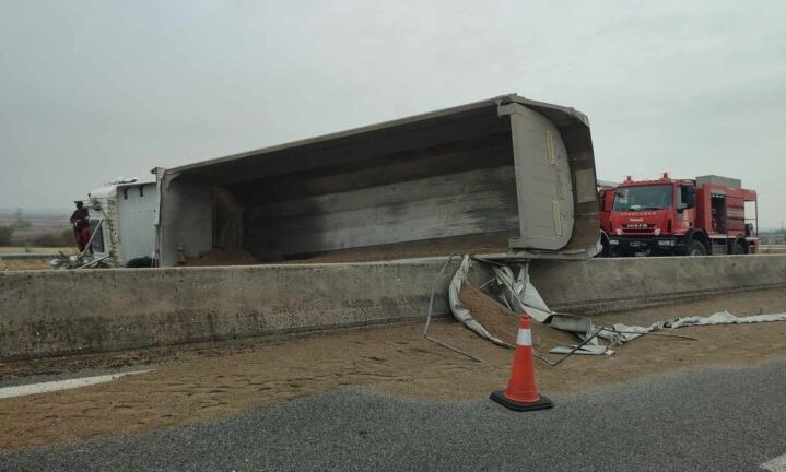 Η νταλίκα ανατράπηκε υπό αδιευκρίνιστες συνθήκες με αποτέλεσμα να προκληθεί σοβαρό τροχαίο