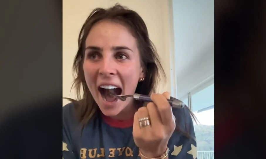Η influencer δοκιμάζει με διστακτικότητα την πρώτη μπουκιά και δείχνει να ανατριχιάζει από αηδία. «Αχ, έχει αυτή την επίγευση», λέει, πιάνοντας το πρόσωπο και στιγμές αργότερα, αρχίζει να κλαίει.