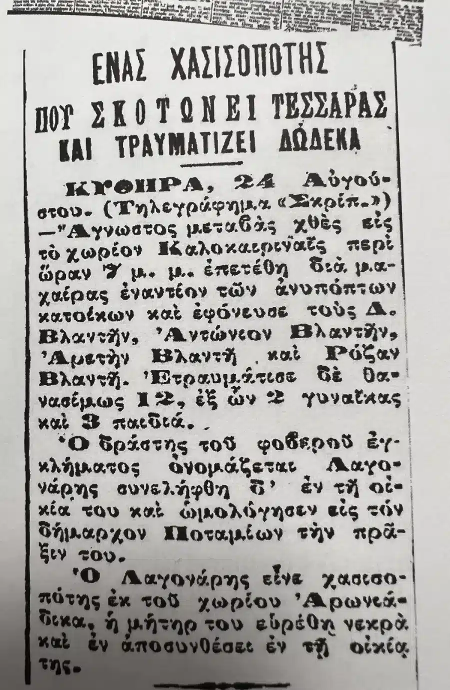 Η μεγαλύτερη και πιο φρικτή δολοφονία στην Ελλάδα: Ήταν 23 Αυγούστου του 1909. Στο χωριό Καλοκαιρινιές στα Κύθηρα κανείς δεν μπορούσε να φανταστεί ότι εκείνη την ηλιόλουστη μέρα θα γραφόταν μια από τις πιο σκοτεινές σελίδες της εγκληματολογίας