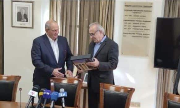 Τον υποδέχθηκε ο Πρόεδρος της Συνεταιριστικής Τράπεζας Βασίλης Κολιός ενώ στην συνάντηση παραβρέθηκαν ο Διευθύνων Σύμβουλος Ιωάννης Βουγιούκας, ο Εντεταλμένος Εκτελεστικός Σύμβουλος Βασίλης Τσουκανέλης, μέλη του Διοικητικού Συμβουλίου και ο πρώην Πρόεδρος Κώστας Ζωνίδης, σύμφωνα με την ίδια ιστοσελίδα.