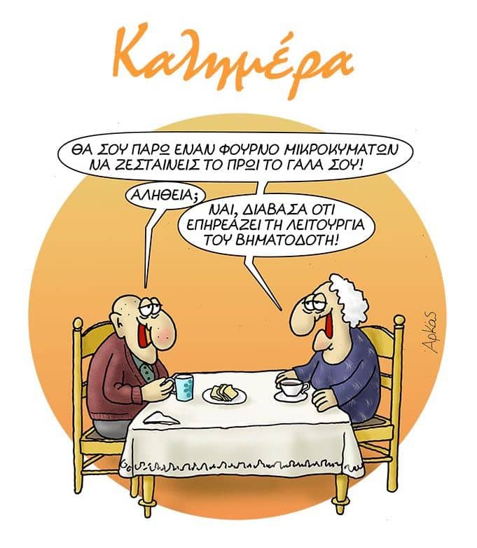 Ο αγαπημένος σκιτσογράφος Αρκάς, γνωστός για το έξυπνο και βιτριολικό χιούμορ του, μας καλημερίζει με ένα ακόμα ξεκαρδιστικό σκίτσο. Πρωταγωνιστές του σημερινού σκίτσου το γνωστό ηλικιωμένο ζευγάρι που τρώει το πρωινό του.