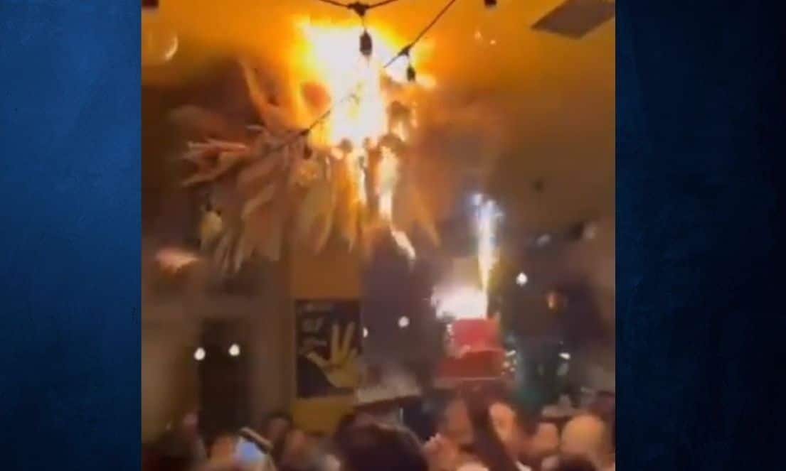Η φωτιά φέρεται να προκλήθηκε από τούρτα που είχε βεγγαλικά, όταν κάποια σπίθα έπεσε πάνω στη χριστουγεννιάτικη διακόσμηση που κρεμόταν στο ταβάνι του καταστήματος, τραυματίζοντας έξι θαμώνες του μπαρ.