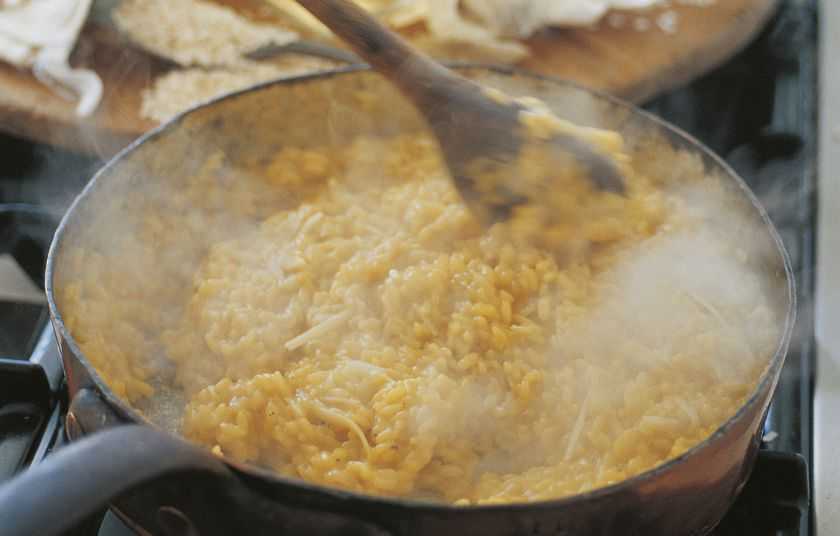 Το μιλανέζικο ριζότο, κλασικό συνοδευτικό του «οσομπούκο», οφείλει το λαμπερό κίτρινο χρώμα του στο σαφράν και την πλούσια γεύση του στο βοδινό μεδούλι. Αντικαθιστούμε το μεδούλι με μπέικον, προσούτο ή πανσέτα, τα οποία έχουμε ψιλοκόψει.