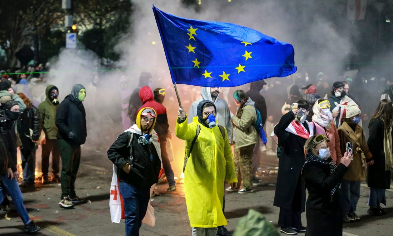 Χιλιάδες διαδηλωτές, οι οποίοι διαμαρτύρονται για την απόφαση της γεωργιανής κυβέρνησης να αναστείλει τις διαπραγματεύσεις για την ένταξή της στην Ευρωπαϊκή Ένωση συγκεντρώθηκαν έξω από το κοινοβούλιο και συγκρούστηκαν με την αστυνομία για δεύτερη συνεχόμενη νύχτα την Παρασκευή.