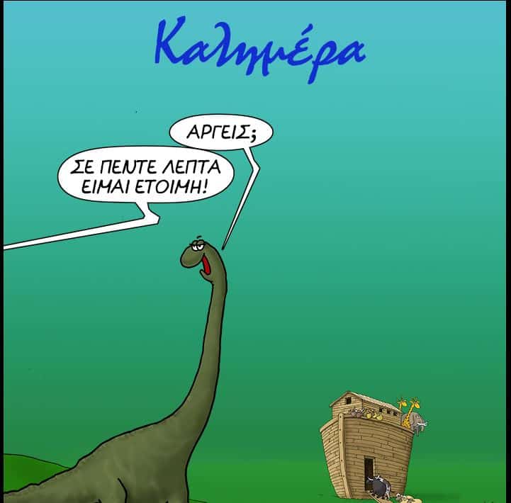 Ο γνωστός σκιτσογράφος Αρκάς μάς καλημερίζει σήμερα με ένα χιουμοριστικό σκίτσο από την Κιβωτό του Νώε. Στο σκίτσο, η κιβωτός γεμίζει με ζώα, ενώ ένας τεράστιος δεινόσαυρος περιμένει απέξω και ρωτά τη σύντροφό του: «Αργείς;». Εκείνη απαντά: «Σε πέντε λεπτά είμαι έτοιμη».