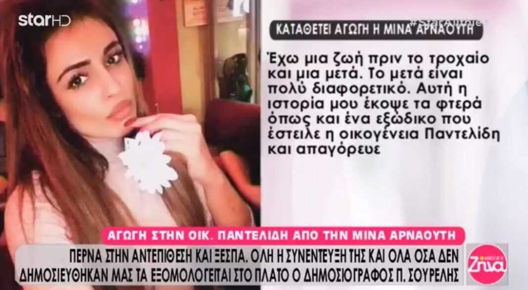Συνέντευξη στο περιοδικό Galia και στον Παναγιώτη Σουρέλη παραχώρησε η Μίνα Αρναούτη, όπου μεταξύ άλλων αποκάλυψε πως θα κάνει αγωγή σε κάποια μέλη της οικογένειεας του Παντελή Παντελίδη.