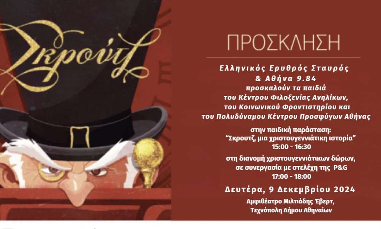 Συγκεκριμένα, τα παιδιά που υποστηρίζονται από το Κέντρο Φιλοξενιάς Ανηλίκων (ΚΦΑΑ), το Κοινωνικό Φροντιστήριο και το Πολυδύναμο Κέντρο Προσφύγων Αθήνας του Τομέα Κοινωνικής Πρόνοιας του Ελληνικού Ερυθρού Σταυρού θα βιώσουν το πνεύμα των Χριστουγέννων στο ΔΕΗ Christmas Factory, καθώς και μέσα από την παιδική παράσταση «Σκρουτζ, μια χριστουγεννιάτικη ιστορία», τη διαχρονική χριστουγεννιάτικη ιστορία του Κάρολου Ντίκενς, από 11μελή θίασο.