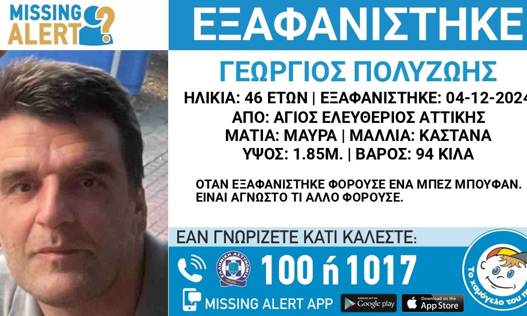 Συναγερμός σήμανε στις Αρχές για την εξαφάνιση 46χρονου από τον Άγιο Ελευθέριο στις 2 Δεκεμβρίου.