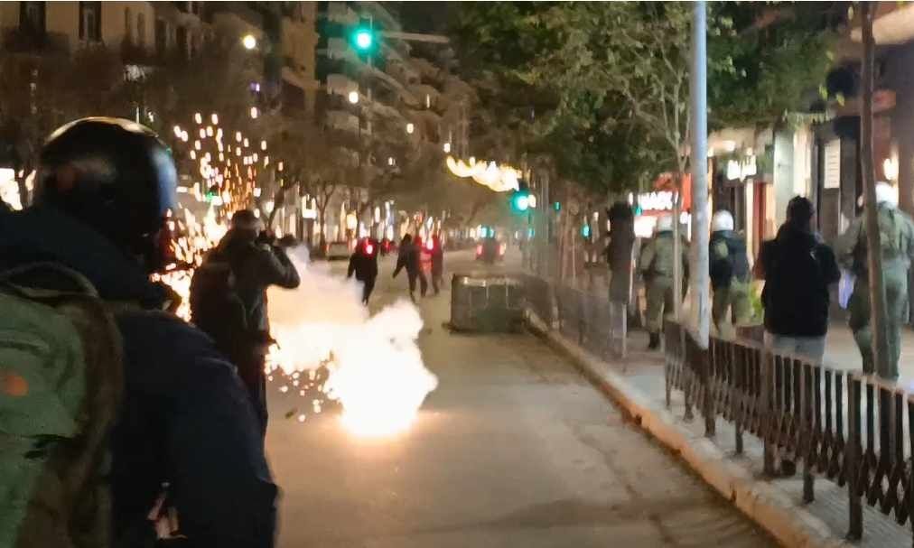 Στη συμβολή των οδών Τσιμισκή και Παύλου Μελά επικράτησε ένταση με αντιεξουσιαστές να πετούν αντικείμενα προς τις αστυνομικές δυνάμεις και δυνάμεις των ΜΑΤ να απαντούν με χειροβομβίδες κρότου λάμψης.