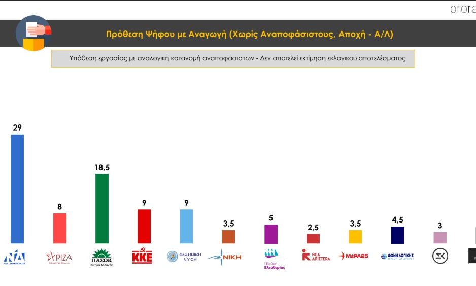 Στην πρόθεση ψήφου με αναγωγή, με αναλογική, δηλαδή, κατανομή των αναποφάσιστων, η ΝΔ εμφανίζεται στο 29%, ακολουθούμενη από το ΠΑΣΟΚ που καταγράφεται στο 18,5%, ενώ στην τρίτη θέση με 9% βρίσκονται ΚΚΕ και Ελληνική Λύση. Ακολουθεί ο ΣΥΡΙΖΑ με 8%, η Πλεύση Ελευθερίας με 5% και η Φωνή Λογικής (Αφροδίτη Λατινοπούλου) με 4,5%. Στο 3,5% καταγράφονται το ΜΕΡΑ 25 και η ΝΙΚΗ, ενώ 3% είναι το ποσοστό του κόμματος Κασσελάκη και 2,5% της Νέας Αριστεράς.