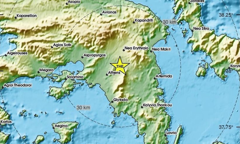 Το ακριβές επίκεντρο τη δόνησης εντοπίζεται στα 7 χλμ. βόρεια – βορειοανατολικά του κέντρου των Αθηνών.