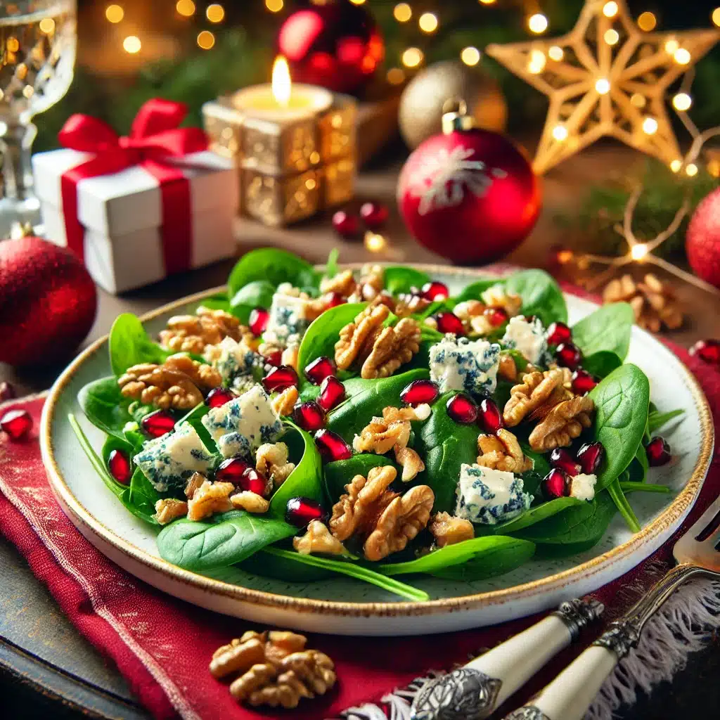 Οι γιορτές είναι η ιδανική ευκαιρία να εντυπωσιάσουμε τους αγαπημένους μας με μια σαλάτα που δεν είναι μόνο γευστική αλλά και άκρως εντυπωσιακή στο τραπέζι. Αυτή η Χριστουγεννιάτικη σαλάτα συνδυάζει τη φρεσκάδα του σπανακιού, τη γλυκύτητα του ροδιού, την πικάντικη νότα του μπλε τυριού και τα καραμελωμένα καρύδια για μια μοναδική εμπειρία γεύσης.