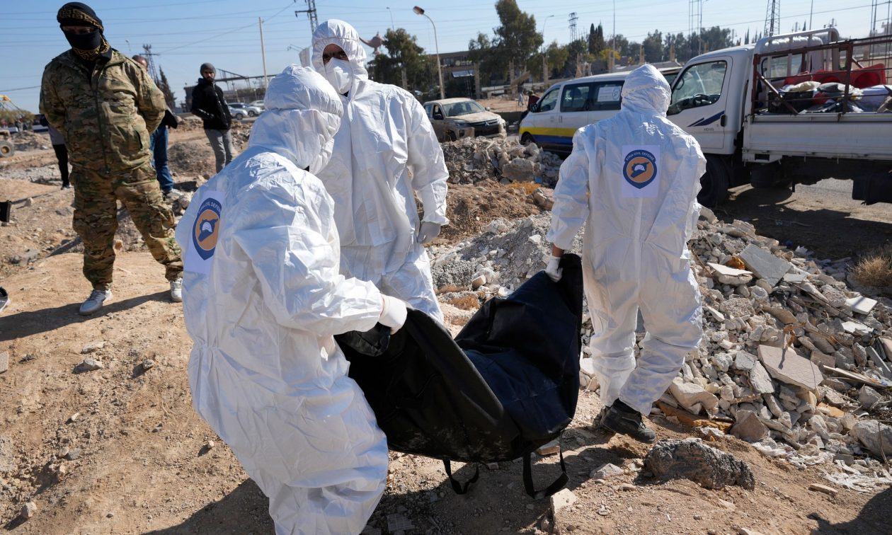 Ένα φορτηγό της Συριακής Πολιτικής Άμυνας, γνωστό ως Λευκά Κράνη, μεταφέρει πτώματα και ανθρώπινα λείψανα .