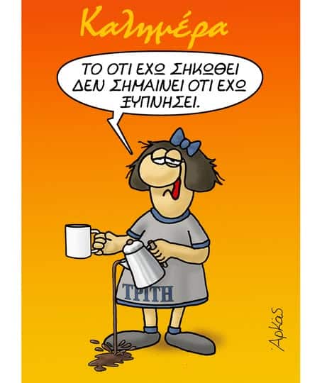 Αρκάς: Η Τρίτη ήρθε, αλλά μάλλον δεν… ξύπνησε ακόμα! Ο αγαπημένος σκιτσογράφος της καρδιάς μας αποτυπώνει με τον μοναδικό του τρόπο τη δυσκολία του πρωινού ξυπνήματος, κάνοντας μας να ταυτιστούμε απόλυτα.