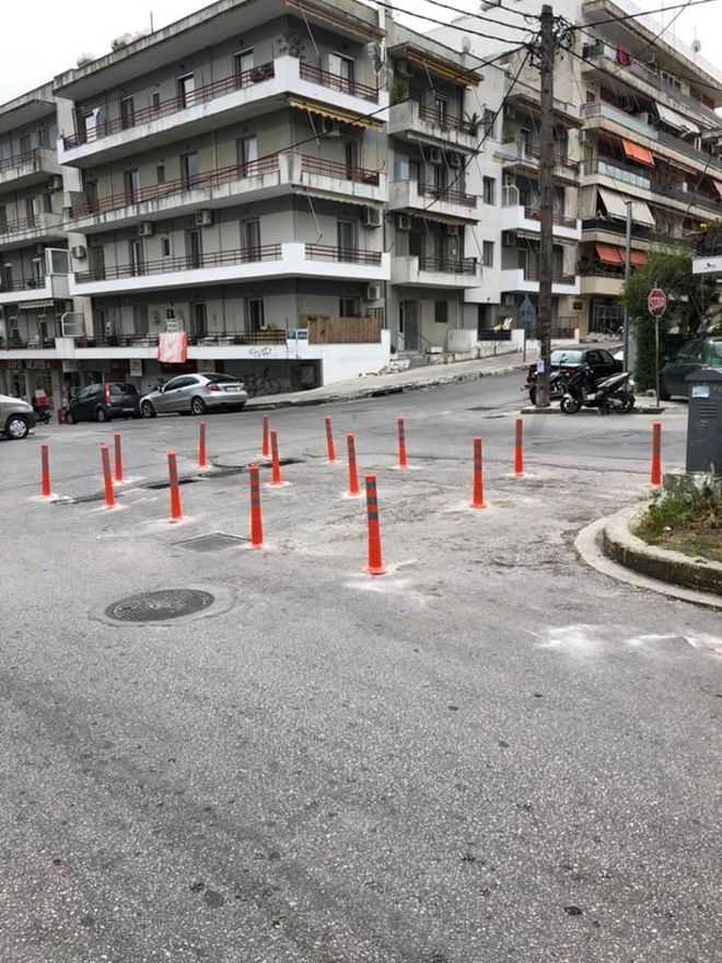 Όπως βλέπετε στην εικόνα που κυκλοφορεί στο facebook, ο δήμος Λέσβου γέμισε κολονάκια στο κενό πριν την νησίδα με σκοπό να αποτρέψει το παρκάρισμα, αλλά και την παράνομη αναστροφή.