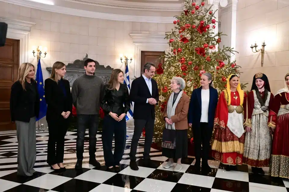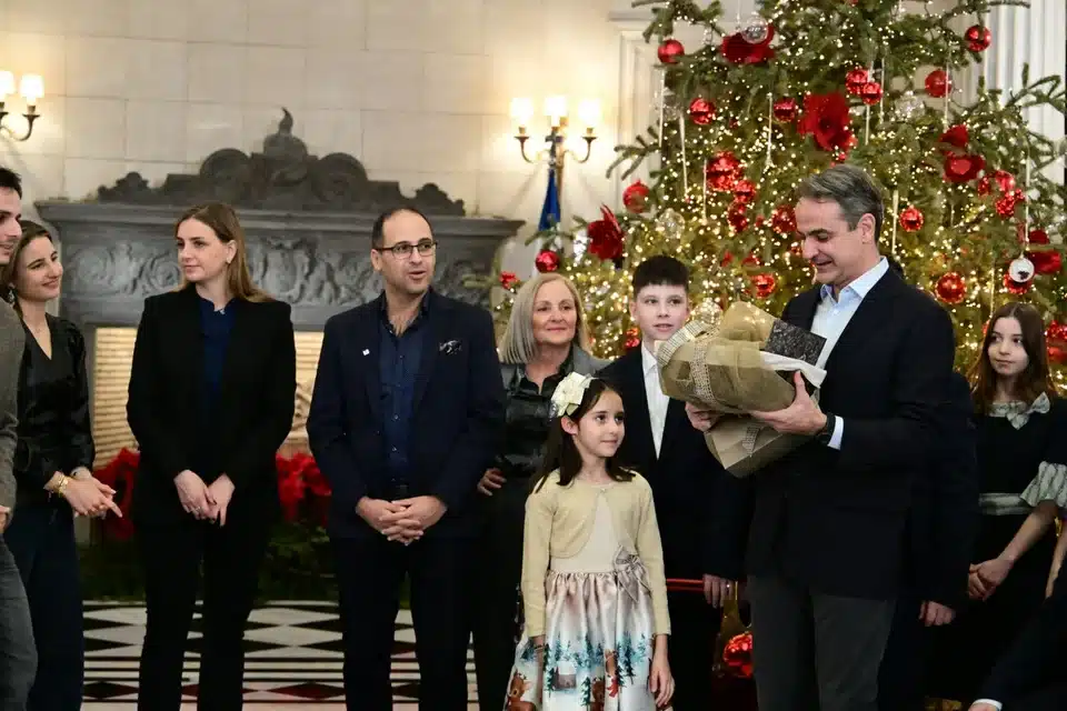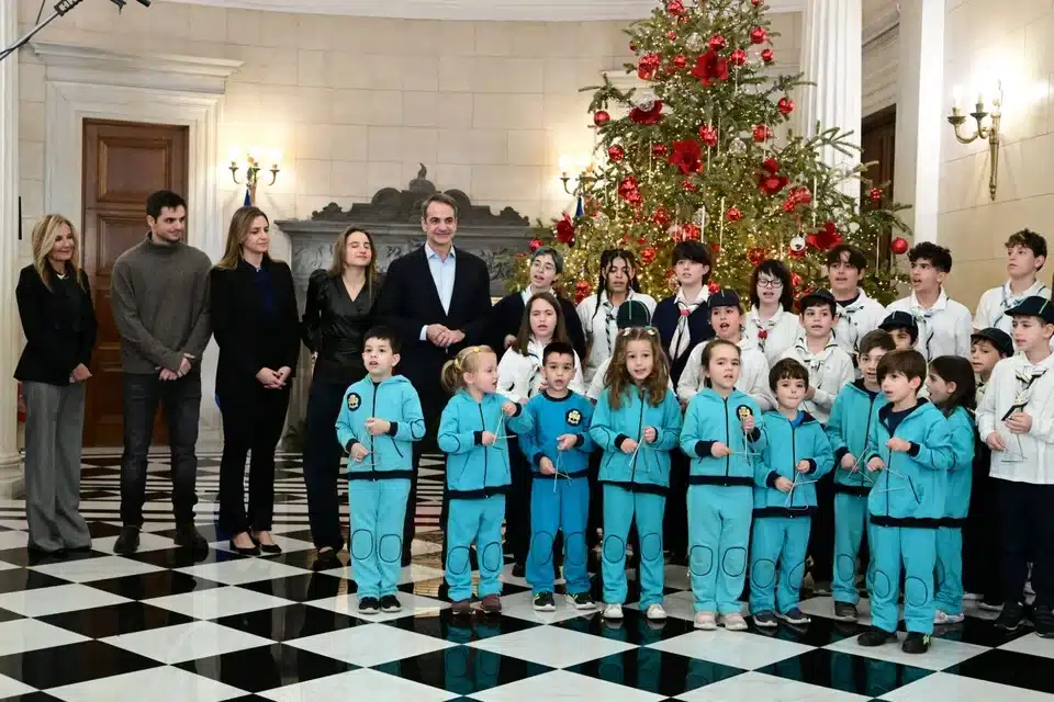 Στο Μέγαρο Μαξίμου βρέθηκαν το Λύκειο των Ελληνίδων, το Σώμα Ελληνικού Οδηγισμού και το Μουσικό Σχολείο Πτολεμαΐδας, προσφέροντας ξεχωριστές χριστουγεννιάτικες μελωδίες. Ο πρωθυπουργός, συνοδευόμενος από τη σύζυγό του Μαρέβα Γκραμπόφσκι-Μητσοτάκη και τα παιδιά τους, Σοφία, Κωνσταντίνο και Δάφνη, συμμετείχε ενεργά στην εορταστική στιγμή.
